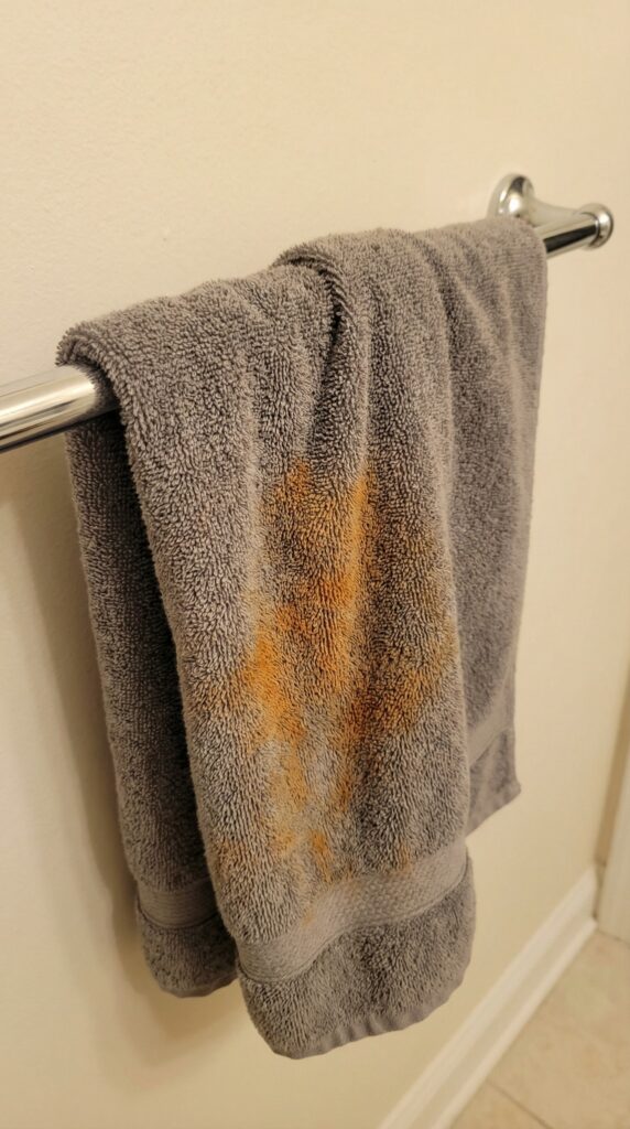 Over the next few weeks, a couple other towels had similar splotches, and all of a sudden my bathroom looked like a pumpkin spice poltergeist had overtaken it. If you’ve ever had towels, pillowcases, or even t-shirts develop those cursed orange splotches that won’t come off, you haven’t gone crazy — there are a few surprisingly common causes.
